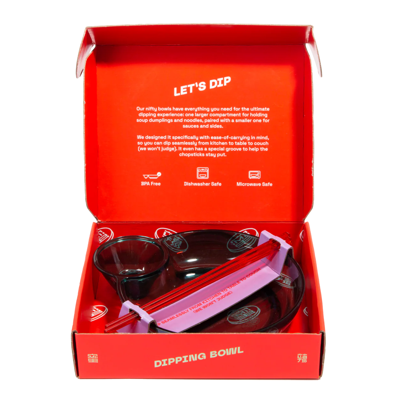 Everything you need for the ultimate dipping experience: one large compartment for holding soup dumplings and noodles, plus a smaller one for sauces and sides. Each set comes with 1 dipping bowl & 1 pair of chopsticks.